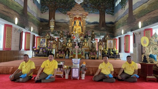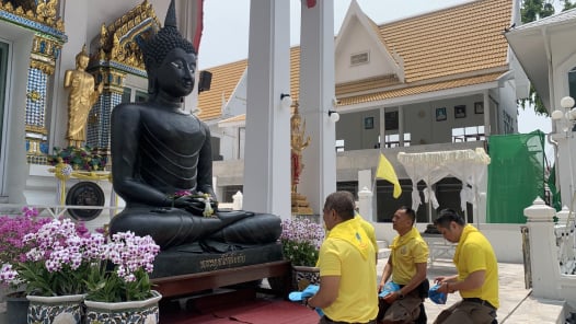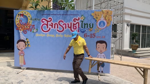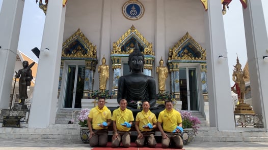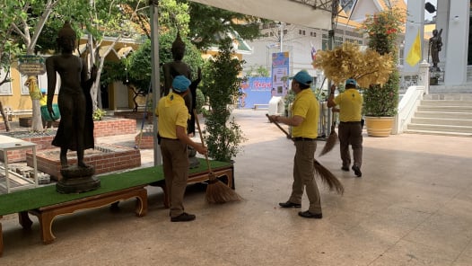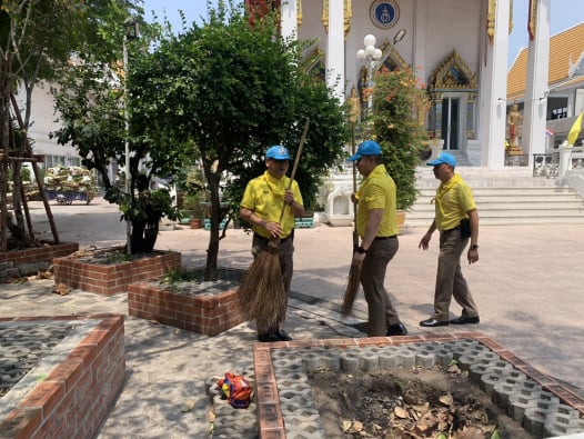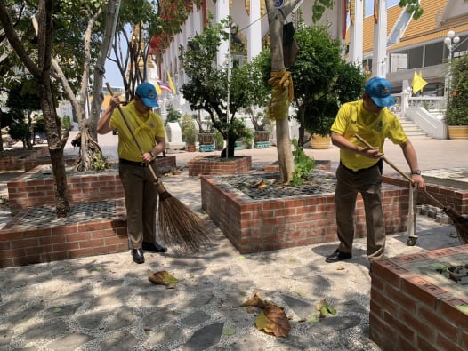 ทำความสะอาด ปรับภูมิทัศน์ กวาดลานพระอุโบสถ จัดสถานที่เตรียมงานทำบุญวันสงกรานต์ ในโอกาสที่เป็นพระภิกษุที่เคยถวายการวิปัสนากรรมฐาน/ได้รับพระราชทานพัดยศ (กลุ่ม 6) ที่อารามหลวงวัดธาตุทอง