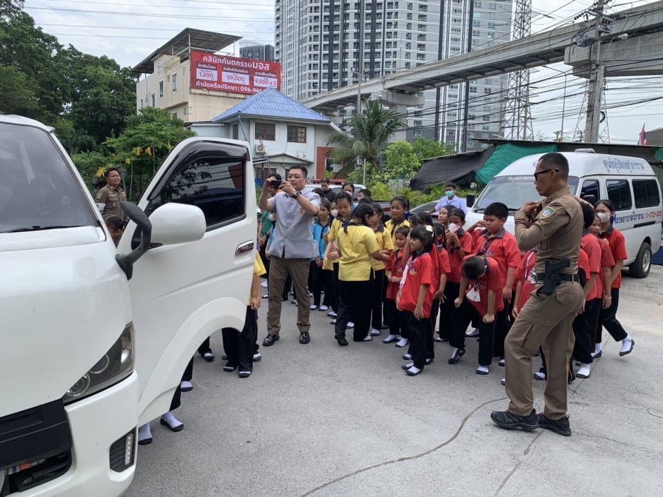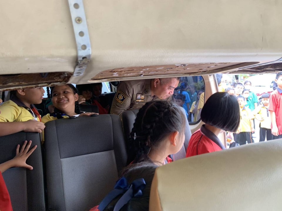 - ให้ความรู้และสาธิตการเอาตัวรอดจากการติดอยู่ในรถตู้รับส่งนักเรียน